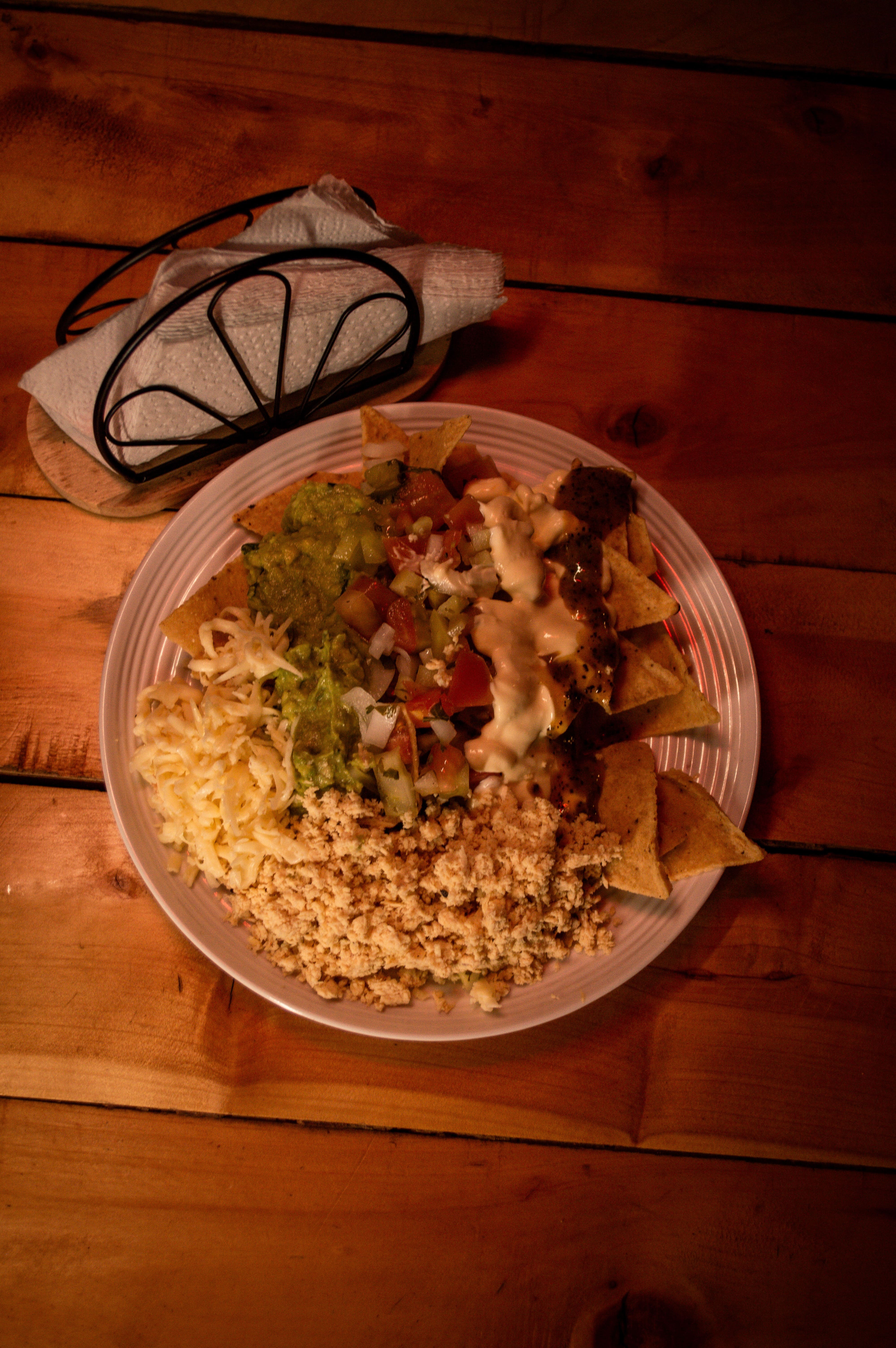 Nachos de maiz con guacamole, pico de gallo, sourcream, queso, pollo desmechado.
