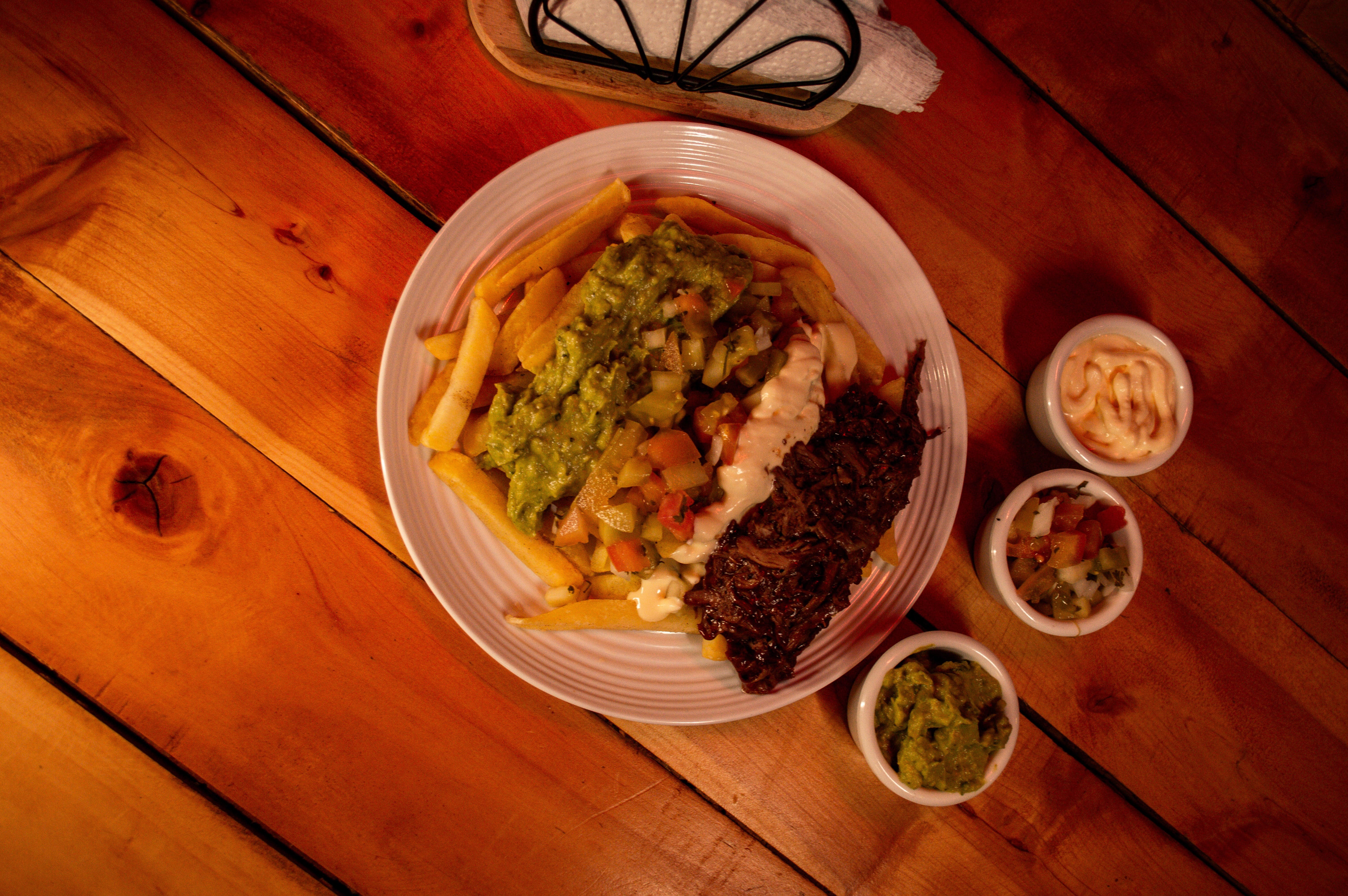 Papas en casco con nuestro guacamole y pico de gallo, salsa de ajo, queso rallado y carne en BBQ.